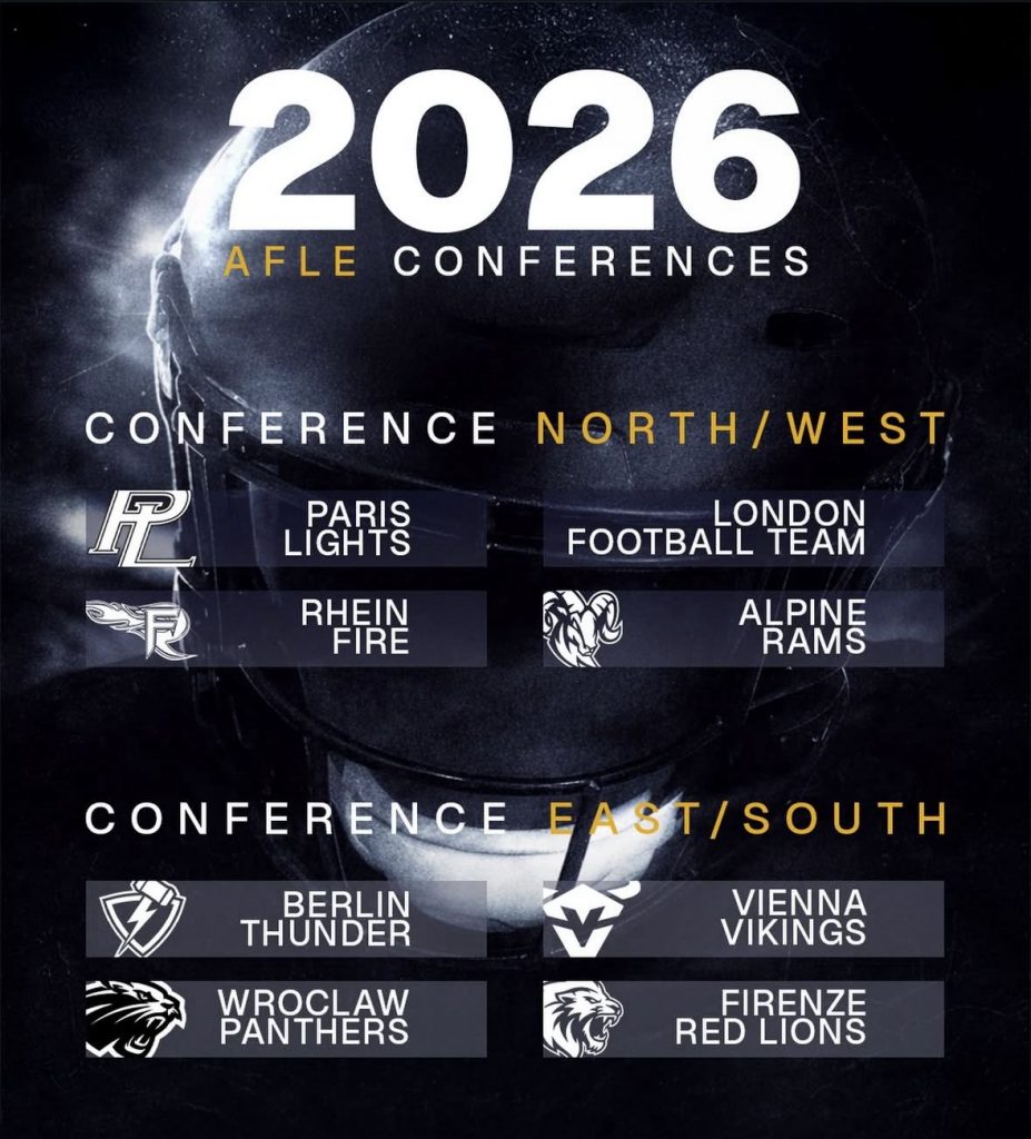 Mit der bestätigten Conference-Struktur ist nun ein weiterer wichtiger Baustein der ersten AFLE-Saison gesetzt, während die Liga ihre Vorbereitungen für den Saisonstart fortsetzt.